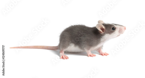 Little rat on white background. Cute pet