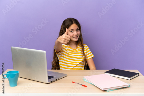 Little student girl in a workplace with a laptop isolated on purple background with thumbs up because something good has happened
