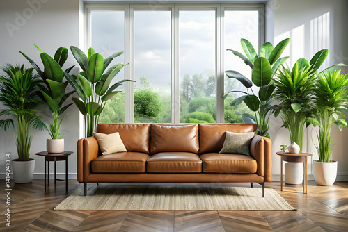 Living room interior with leather sofa and green plants on transparent wall background 3D rendering