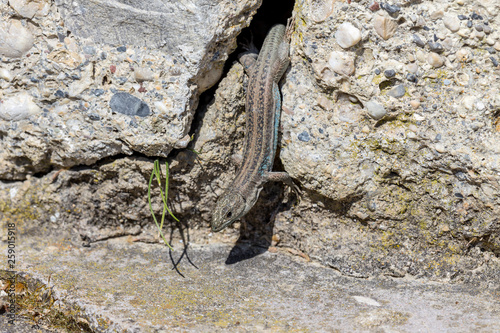 Lizard (Podarcis peloponnesiacus) sitting on a stones close-up in a sunny day