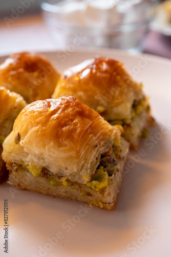 Local Turkish baklava on a white plate in a 360 degree rotating display case
