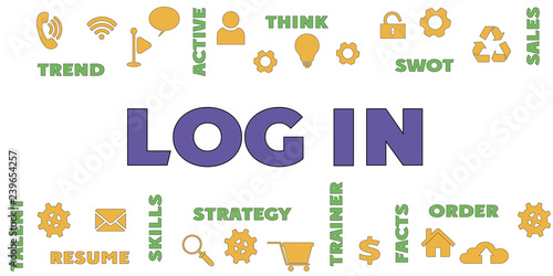 LOG IN Panoramic Banner with icons and tags, words. Hi tech concept. Modern style