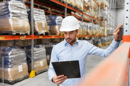 logistic business, shipment and people concept - businessman in helmet with clipboard checking goods at warehouse