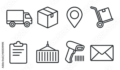 logistic, icon, truck, box, location, cart, clipboard, container, scanner, envelope, delivery, transport, shipment, package, mail, cargo, marker, dolly, barcode, shipping, symbol, graphic, outline, transportation, item, parcel, distribution, warehouse, storage, freight, postal, business, commercial, industry, service, network, retail, global, supply, route, e-business, communication, address, management, efficiency