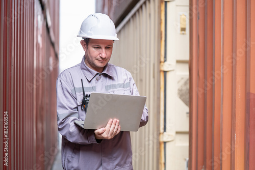 Logistics manager analyzing data in shipping container yard warehouse environment professional viewpoint efficiency concept