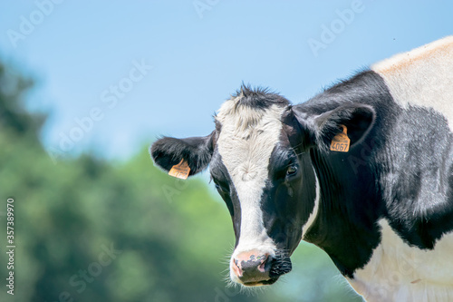 Loire-Atlantique, France, June 2020: photo of a head of a Norman cow in the marshes of Sainte Lumine de Coutais.