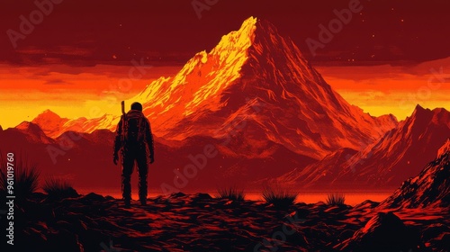mountain, sunset, landscape, man, silhouette, sky, red, nature, rock, hill, peak, figure, horizon, art, digital, illustration, mountainous, astronomy, trekking, exploration, adventure, travel, alone, distant, dramatic, solitude, serenity, calmness, gloomy, twilight, night, dark, view, scenery, climber, vista, crimson, outdoors