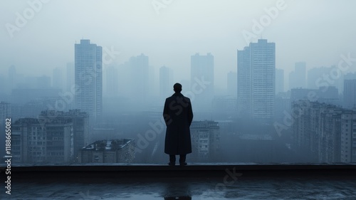 Lone figure silhouetted on rooftop overlooking urban landscape foggy atmosphere dramatic viewpoint