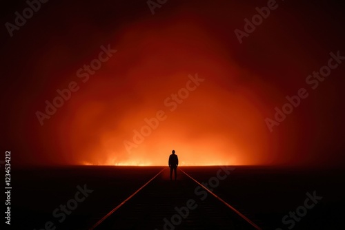man, silhouette, track, train, railway, fire, flames, orange, red, dark, night, horizon, alone, lonely, desolate, mysterious, ominous, eerie, scarey, dramatic, landscape, scene, mood, atmosphere, fog, smoke, mystical, surreal, abstract, shadow, figure, standing, distant, light, glow, intense, burning, heat, huge, pathway, journey, destination