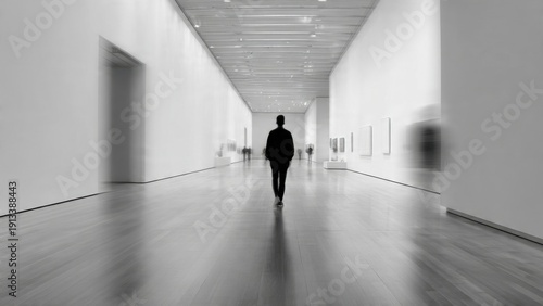 Lone Figure Walking Through Modern Art Gallery