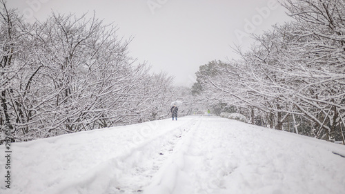Lone man with an umbrella walking on ground-covered snow at Keage Incline during a rare heavy snowfall in Kyoto City during a cold winter.