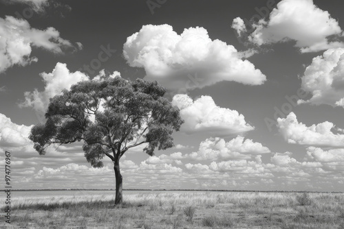 tree, solitary, field, cloud, sky, black, white, landscape, nature, dramatic, open, huge, horizon, serene, peaceful, monochrome, photo, outdoors, scenery, tranquil, isolated, countryside, rural, environment, wilderness, calm, simplicity, minimalism, artistic, contrast, atmospheric, scenic, timeless, beauty, natural, empty, space, solitude, quiet, stillness, plain, prairie, winter, snow, grass, tree, blue, summer