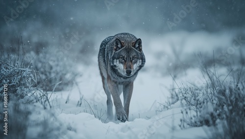 Lone wolf walking through snowy forest landscape in winter showing wildlife survival and cold environment