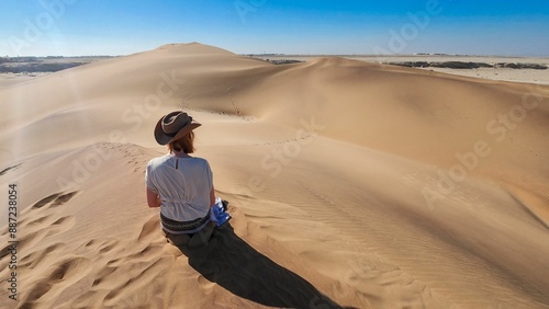 Lone women traveling in a desert with sand dunes and a clear blue sky in Namibia, Africa