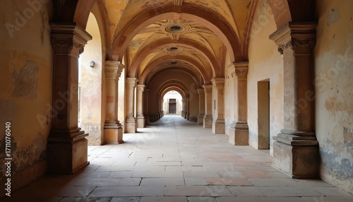 Long arched corridor in old historic building with many columns. Faded walls, stone floor show age. Path leads to door at end. Ancient architecture brings serene atmosphere, reflecting past culture,