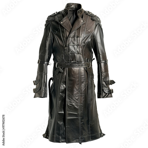 coat, leather, black, fashion, clothing, apparel, style, design, wear, garment, long, trench, mannequin, isolated, white, background, studio, shot, nobody, buckle, buckle, strap, strap, belt, stylish, modern, elegant, luxury, gothic, rocker, alternative, dark, dramatic, edgy, cool, confident, powerful, strong, outerwear, autumn, winter, menswear, male, man, trendy, fashionable, chic, runway