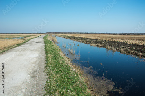 nature, landscape, water, sky, country, countryside, travel, blue, road, field, horizon, dirt, grass, grooved, irrigation, spring, path, rural, river, meadow, way