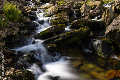 Long exposure image of a cascading mountain stream tumbling over moss covered rocks at Nant Peris, Snowdonia, Llan Beris Pass Wales
