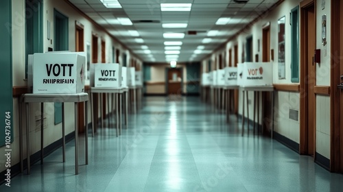 Long hallway lined with voting booths and tables in an indoor setting with ceiling lights