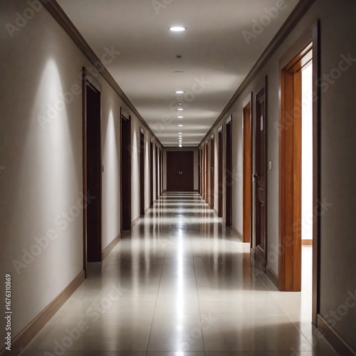 hallway, corridor, interior, door, hotel, apartment, building, perspective, empty, light, modern, roomy, clean, polished, floor, wall, illuminated, design, architecture, room, beige, brown, wooden, shadow, symmetry, calm, quiet, elegant, long, straight, wide