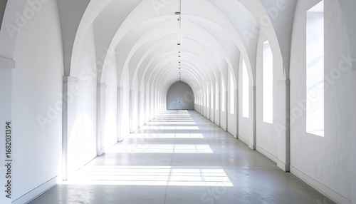Long White Corridor with Vaulted Archways and Sunlight Streaming In