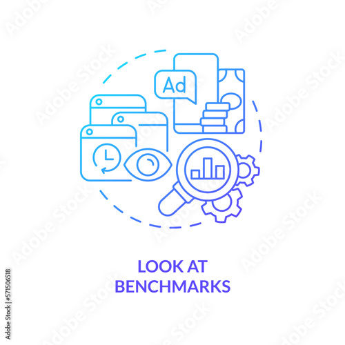 Look at benchmarks blue gradient concept icon. Promotion tools. Get started with social media advertising abstract idea thin line illustration. Isolated outline drawing. Myriad Pro-Bold font used