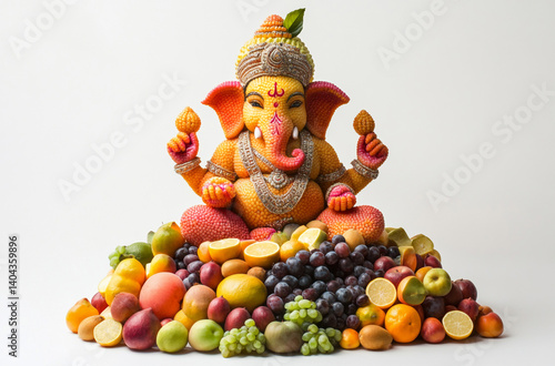 Lord Ganesha Fruit Sculpture on Pile of Fresh Fruits, Indian Festival