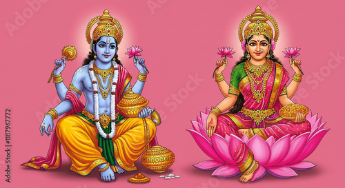 Lord Vishnu and Goddess Lakshmi Seated on Lotus