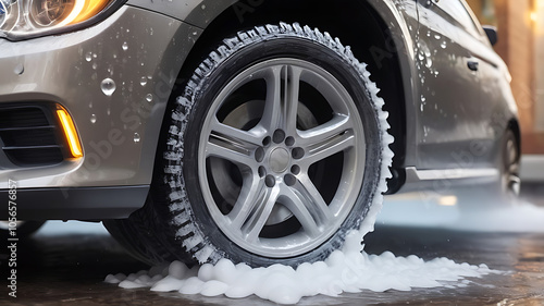 lose-up shot of a car tire and wheel rim covered in soap foam, with water dripping down against a soft bokeh background.