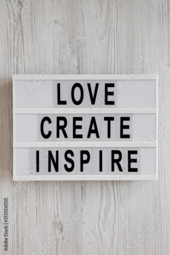 'Love create inspire' words on a lightbox on a white wooden background, top view. Overhead, from above, flat lay.