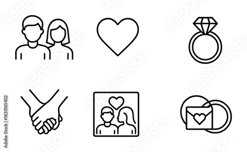 Love Icon Set. Outline icon set of couples and love: couple, heart, engagement ring, kiss, hands holding,