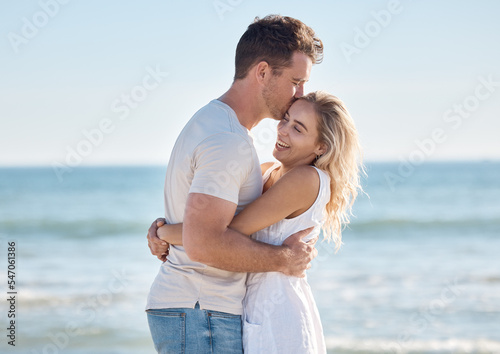 Love, kiss and happy couple hugging on a beach while on a romantic summer vacation together in Australia. Travel, freedom and young man and woman embracing in nature by the ocean on honeymoon holiday