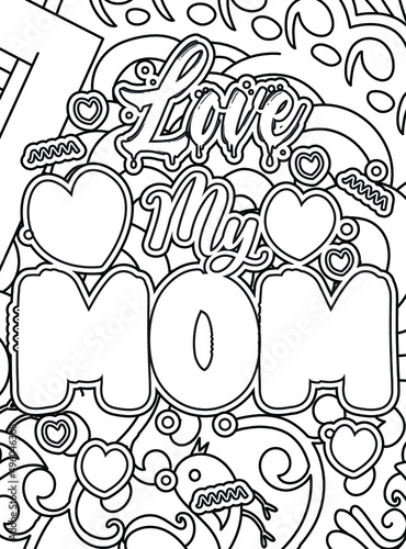 Love my mom .Mother's day Typography Coloring page.Mother's line Art design.