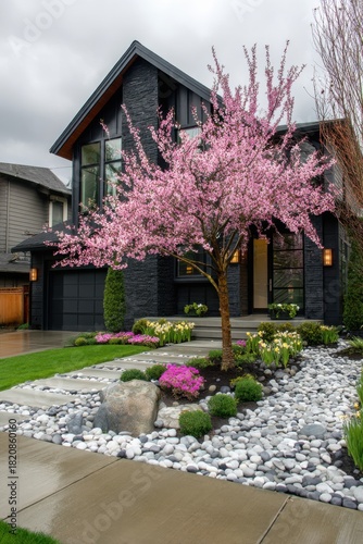 cherry, blossom, modern, house, spring, landscaping, flower, grey, sky, home, architecture, colours, residential, front, yard, garden, nature, scenery, rock, paseo, blooming, green, grass, suppressing, attracted, calmness, elegant, design, seasonal, beauty, flowering, tree, tidy, exterior, peaceful, setting, lush, plant, urban, landscape, flower, bed, aesthetic, decor, springtime, bright, detail, decoration