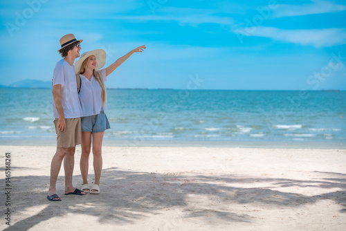 beach, couple, vacation, summer, holiday, romantic, travel, love, ocean, sea, sand, together, happiness, freedom, explore, get-away, tour tourism, sun, sunny day, pointing, outdoors, destination, horizon, tropical, nature, relax, peaceful, human relationships, young people, adventure, resort, sea breeze, lover, smile, clear sky, lifestyle, fun, journey, honeymoon, looking away, serene, affectionate, bonding, joyful