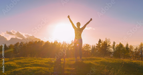 woman, happy, cheerful, outstretched, arm, dog, puppy, sunbeam, lens, sun, flare, mountain, alps, grassfield, meadow, sunset, successful, joyful, ecstatic, excited, success, sunrise, gold, light, accomplished, morning, evening, beautiful, scenery, fun, active, celebrate, female, holiday maker, young, people, forest, sunshine, hill, sporty, athletic, caucasian, idylli, picturesque, scenic, animal, julian, slovenia, europa
