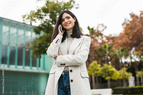 Low angle of glad female entrepreneur talking on smartphone and standing in street while discussing business project and looking away