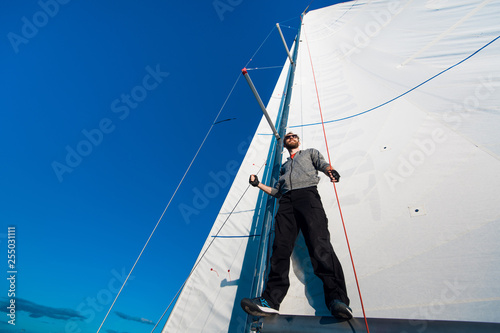 Low angle shot of a young man sailor wearing sunglasses and gloves on a sailing boat at sunset. Image toned in warm colors.