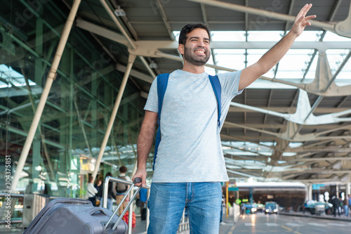 Low angle shot of smiling traveler waving hand near airport. Cheerful young man trying to stop car. Travel concept