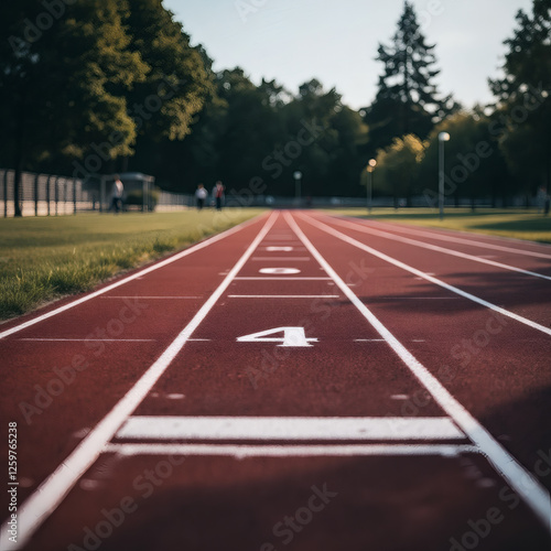 Low angle view of an isolated running track, perfect for sports, fitness, and athletic themes. Ideal for motivational and action-packed designs.