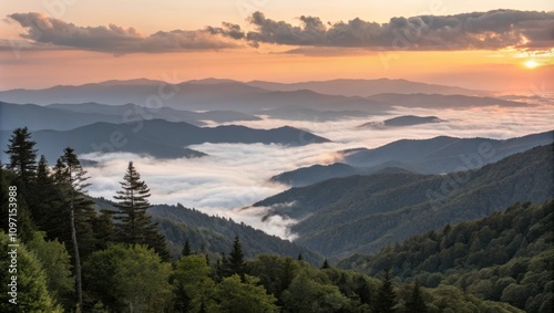 Low Clouds Hovering in Valley at Sunset View From Clin Standard Overlook. Generative AI