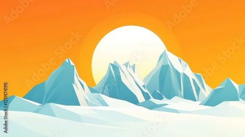 mountain, snow, sunset, sun, landscape, winter, peak, ice, cold, nature, scenic, view, sky, horizon, background, scene, graphic, design, art, illustration, vector, image, abstract, geometric, polygonal, digital, artwork, element, style, vibrant, bright, orange, light, shadow, texture, pattern, shape, form, colours, tone, hue, composition, aesthetic, serene, tranquil, peaceful, majestic, grand