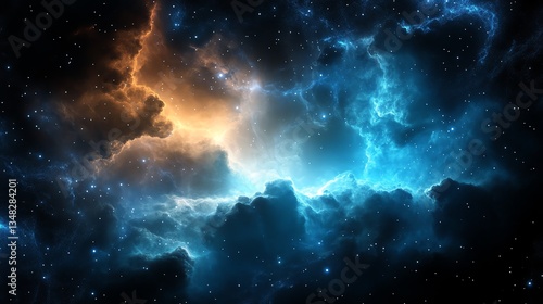 Luminous particles floating in deep blue space, mysterious abstract cosmic background