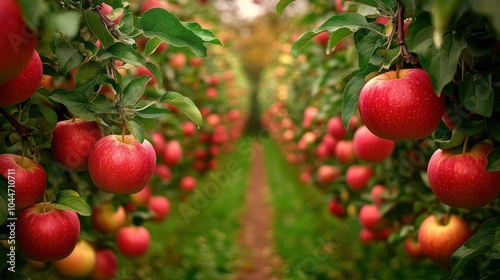Lush Apple Orchard with Ripe Trees and Pathway