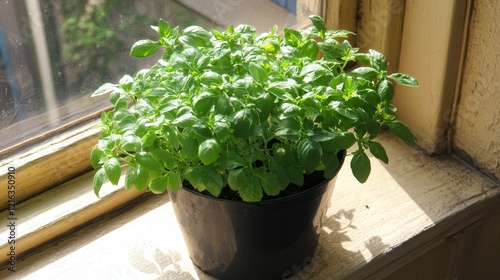 Lush Basil and Parsley Plants Thriving on Sunlit Windowsill Close-Up Botanical Background
