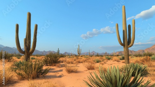 Lush Desert Landscape with Cactus and Clear Blue Sky Under Sunlight