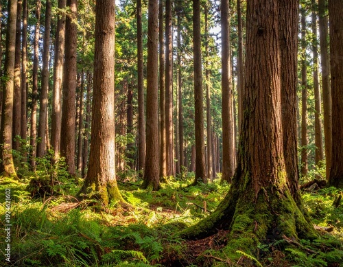 forest, tree, nature, green, sunlight, timberland, canopy, moss, trunk, branch, leaf, light, shadow, ecology, environment, growth, flora, wilderness, outdoors, landscape, natural, tall, vertical, texture, detail, ecosystem, biodiversity, peaceful, serene, tranquil, majestic, ancient, root, ground, path, pathway, sunbeam, atmosphere, vibrant, fresh, clean, healthy, preservation, conservation, explore