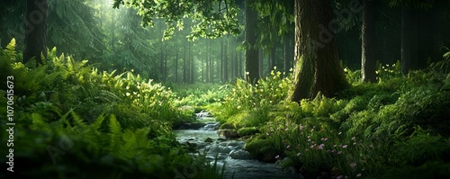 Lush forest landscape in vibrant green tones, illuminated wildflowers by the stream, capturing the essence of unspoiled nature