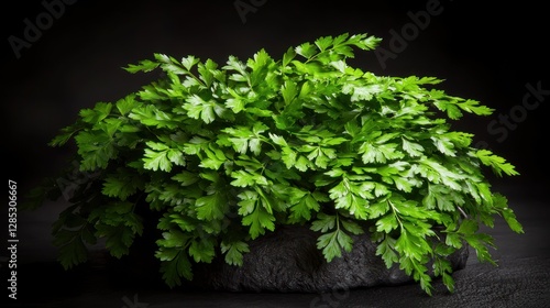Lush green fern plant resting on a dark stone surface, showcasing vibrant foliage against shadows