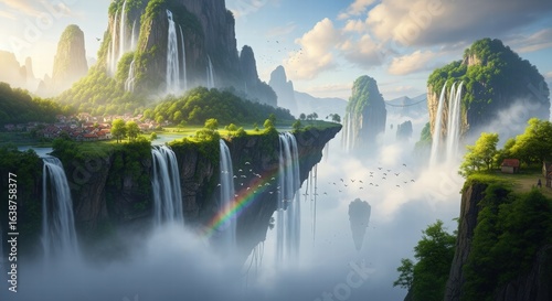 island, floating, green, waterfall, cascading, lush, cliff, mist, cloud, rainbow, nature, landscape, mountain, bridge, village, tree, grass, sky, daylight, aerial, fantasy, idylli, serene, calm, rural, misty, hazy, scenic, rocky, sunny, bird, flying, foliage, hill, horizon, distant, adventure, travel, exploration, tour tourism, peaceful, vibrant, beautiful, environmental, geologic, vista, panoramic